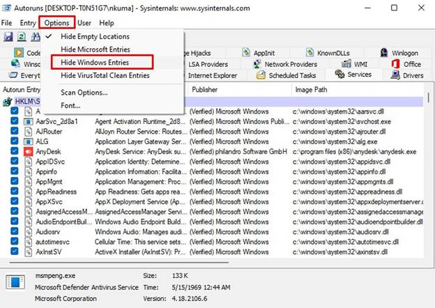 Bước 8: Sau khi tap Service xuất hiện thì bạn chọn vào Options > bỏ tick mục Hide Windows Entries